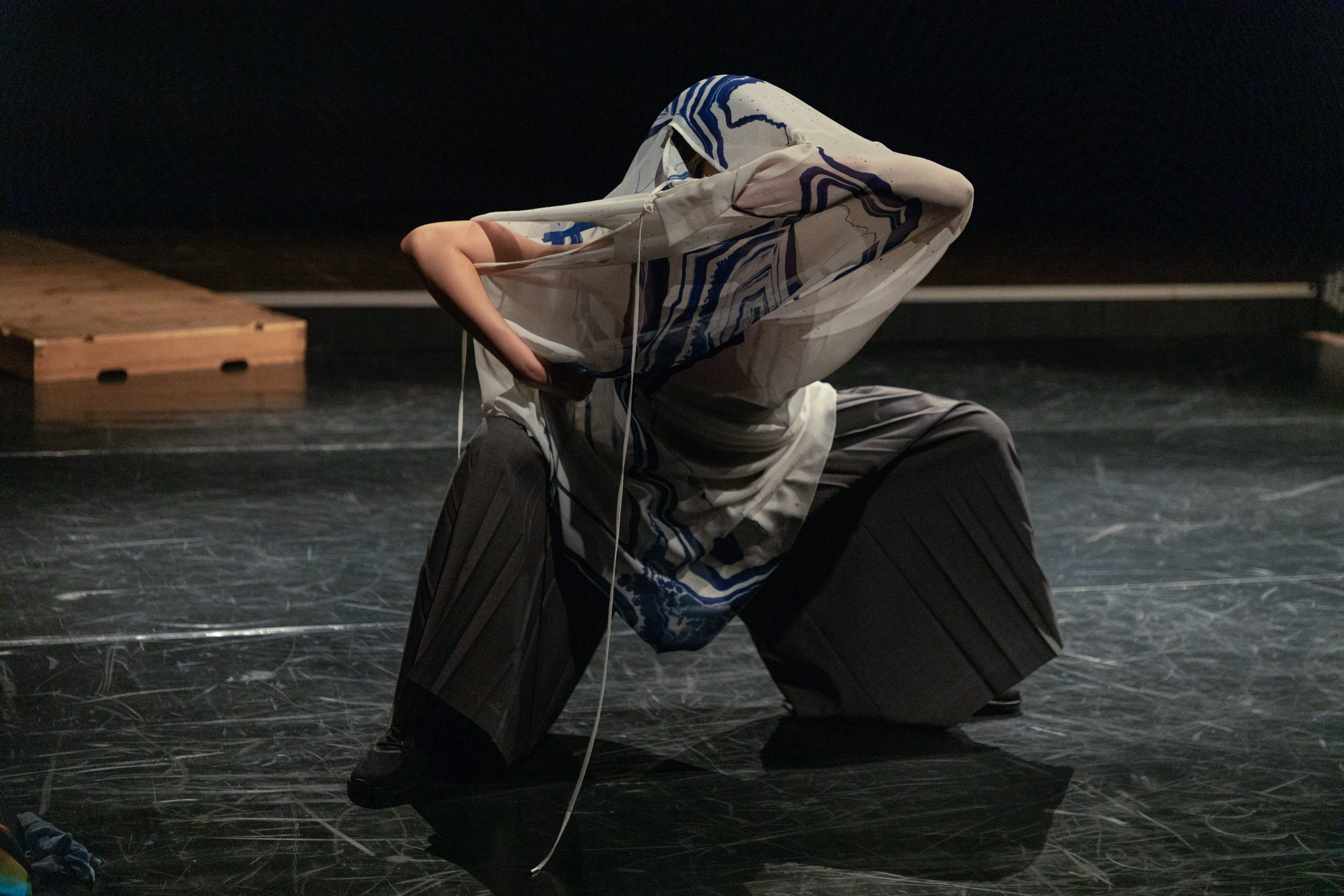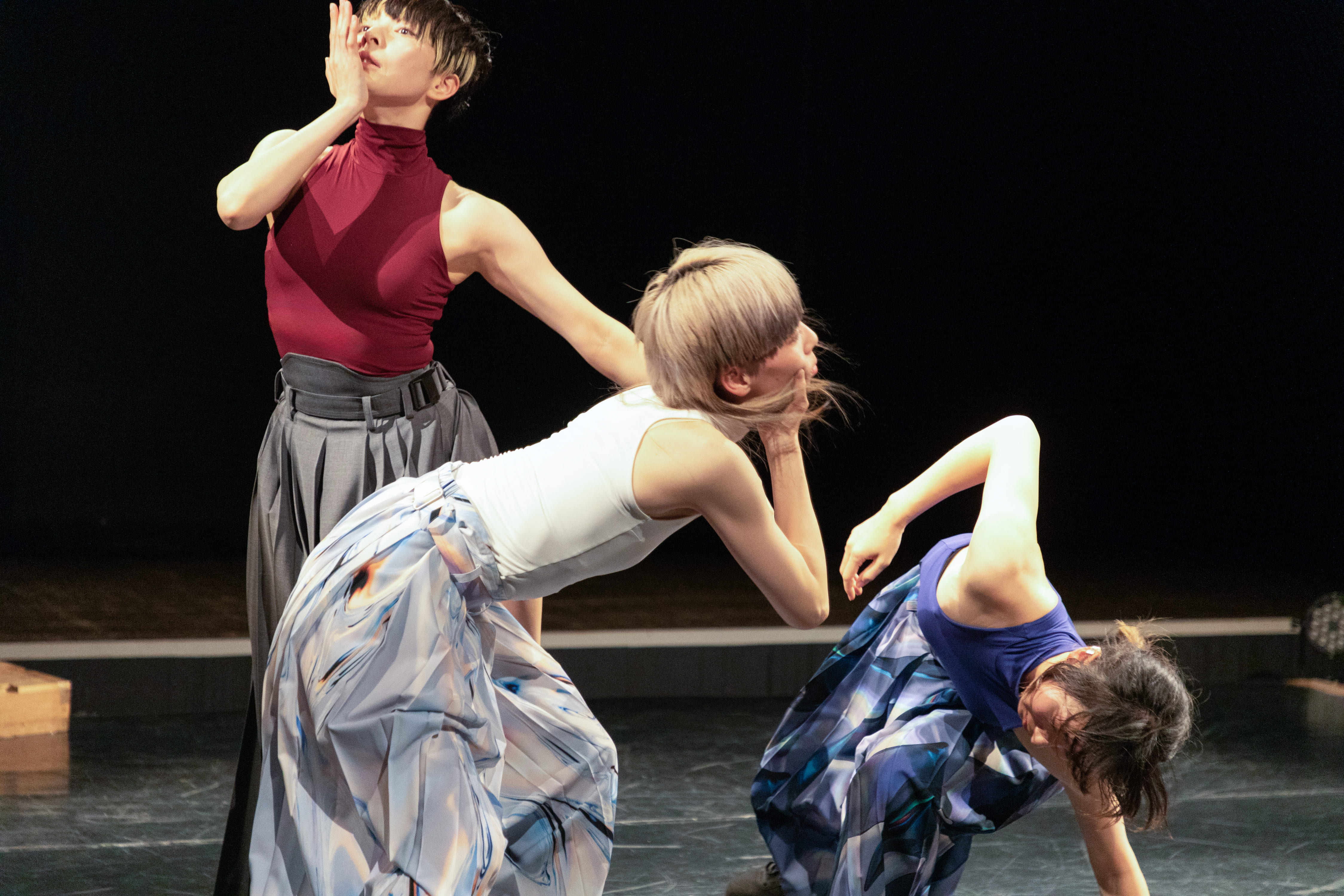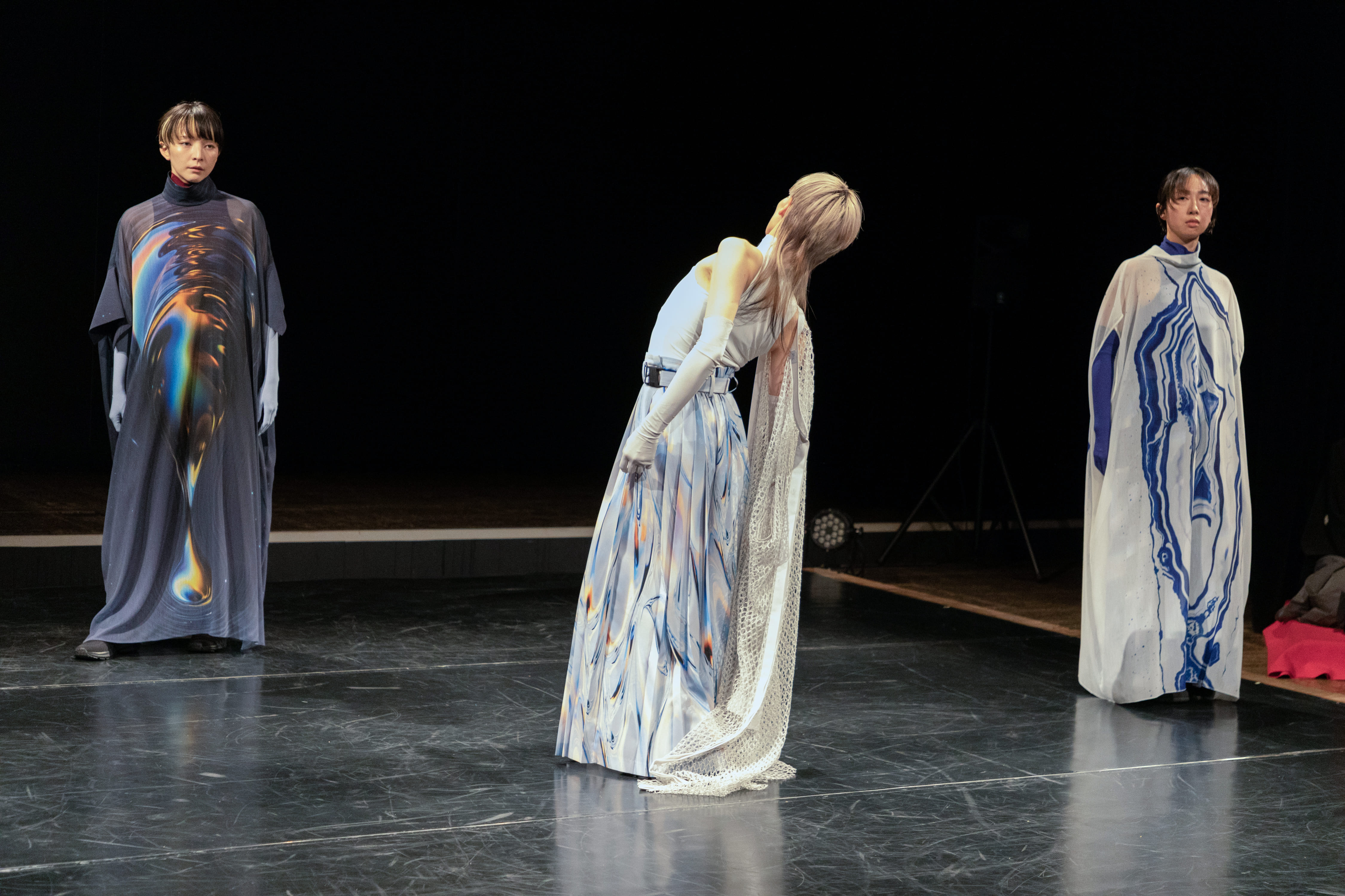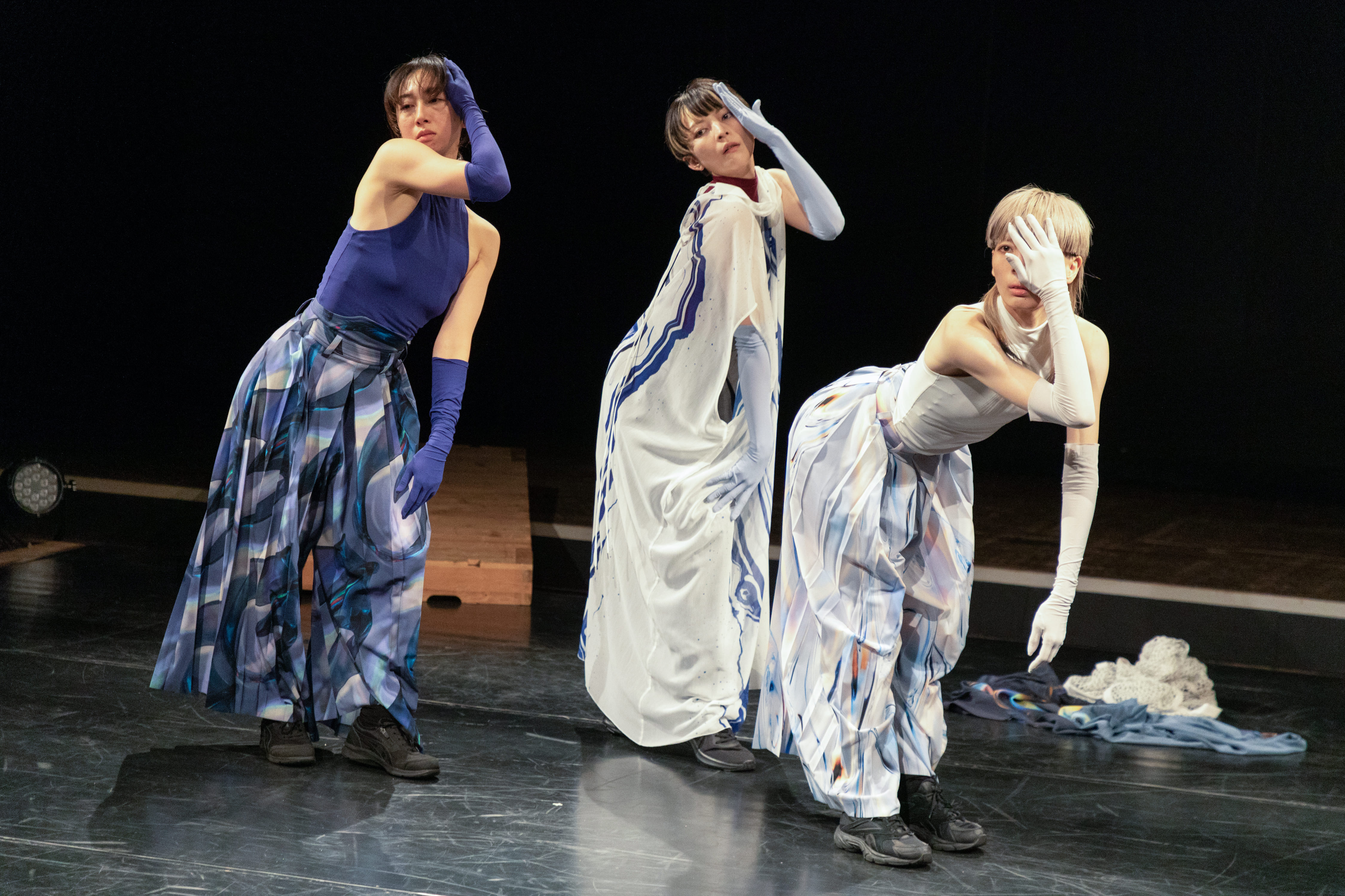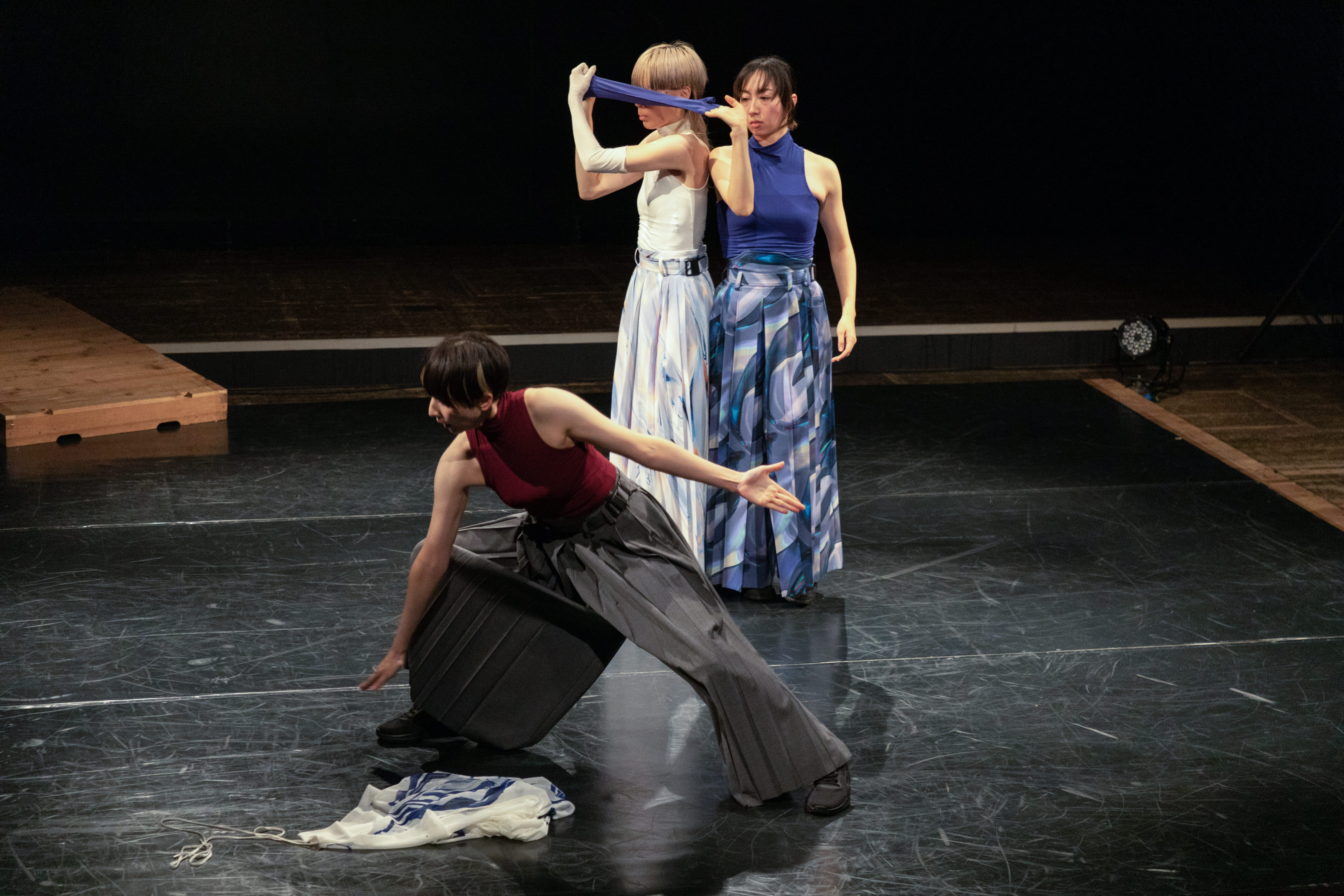 また、「双面ディレイ」の舞台前半で三人のダンサーたちは和服のような直線断ちの服を羽織り、ボディラインを隠していた。つまり、女性であることのアピールを封じ込めていた。