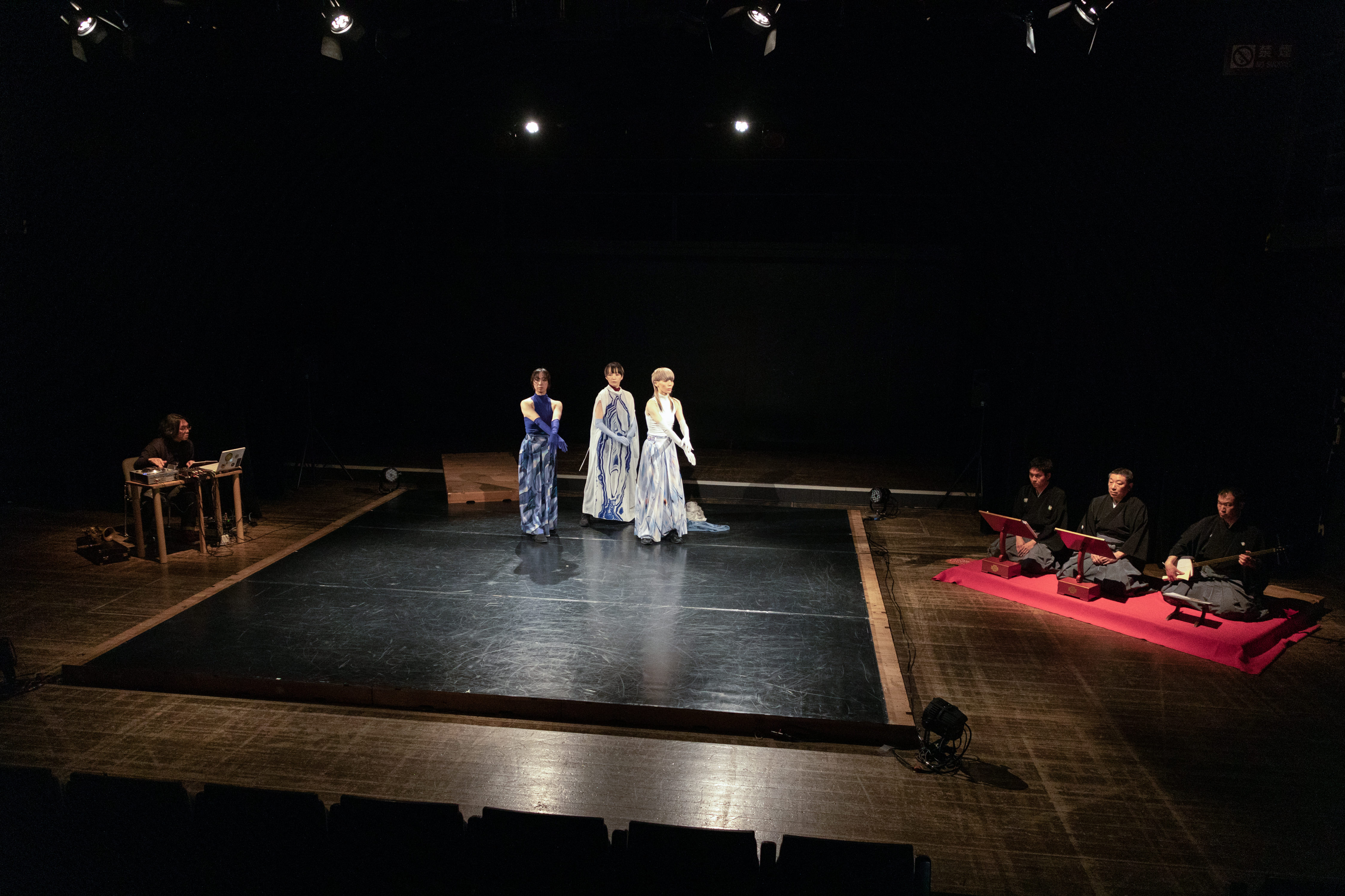 伝統と現代が交錯する本作では、三味線にピックアップマイクがついていた。菊与志郎の演奏をその場で取り込んで電気信号に変換し、大谷の操作によって新しい音楽へと発展させたのである。生演奏の三味線と、そのゴーストであるかのような音がズレたり重なったりして「双面ディレイ」の世界観を提示した。