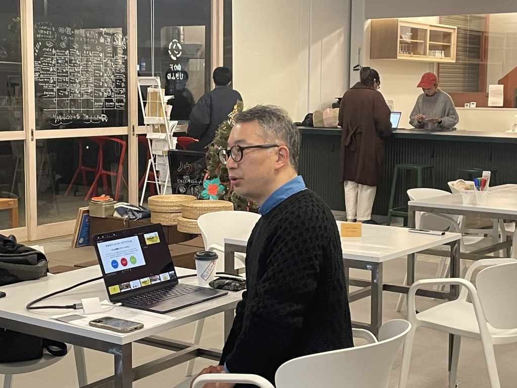 4人目のゲストは、すみだクリエイターズクラブ(クリクラ)の三田大介さん。墨田区関係の会議室が会場となることの多い寄合ですが、この回は2024年10月にオープンしたばかりのカフェ/レンタルスペース「ノウドひきふね」が会場となりました。地域にひらいた作業スペースやシェア本棚などがあり、東武スカイツリーライン曳舟駅前の便利な立地です。